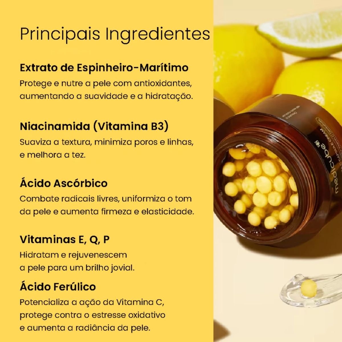Principais ativos: Vitamina C encapsulada, niacinamida, ácido ferúlico, vitamina E