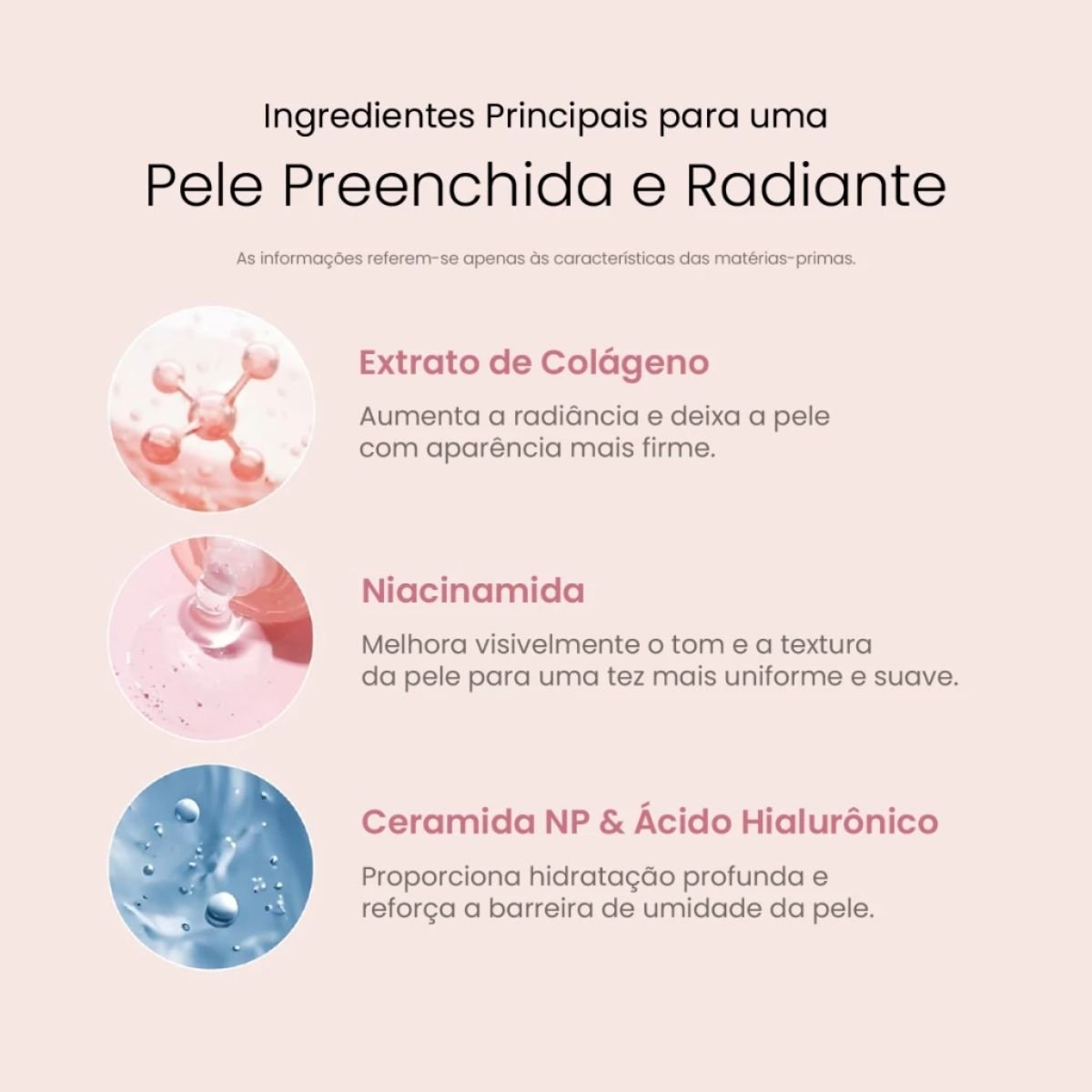 Principais ativos: Colágeno, ácido hialurônico, niacinamida, ceramidas e vitamina E